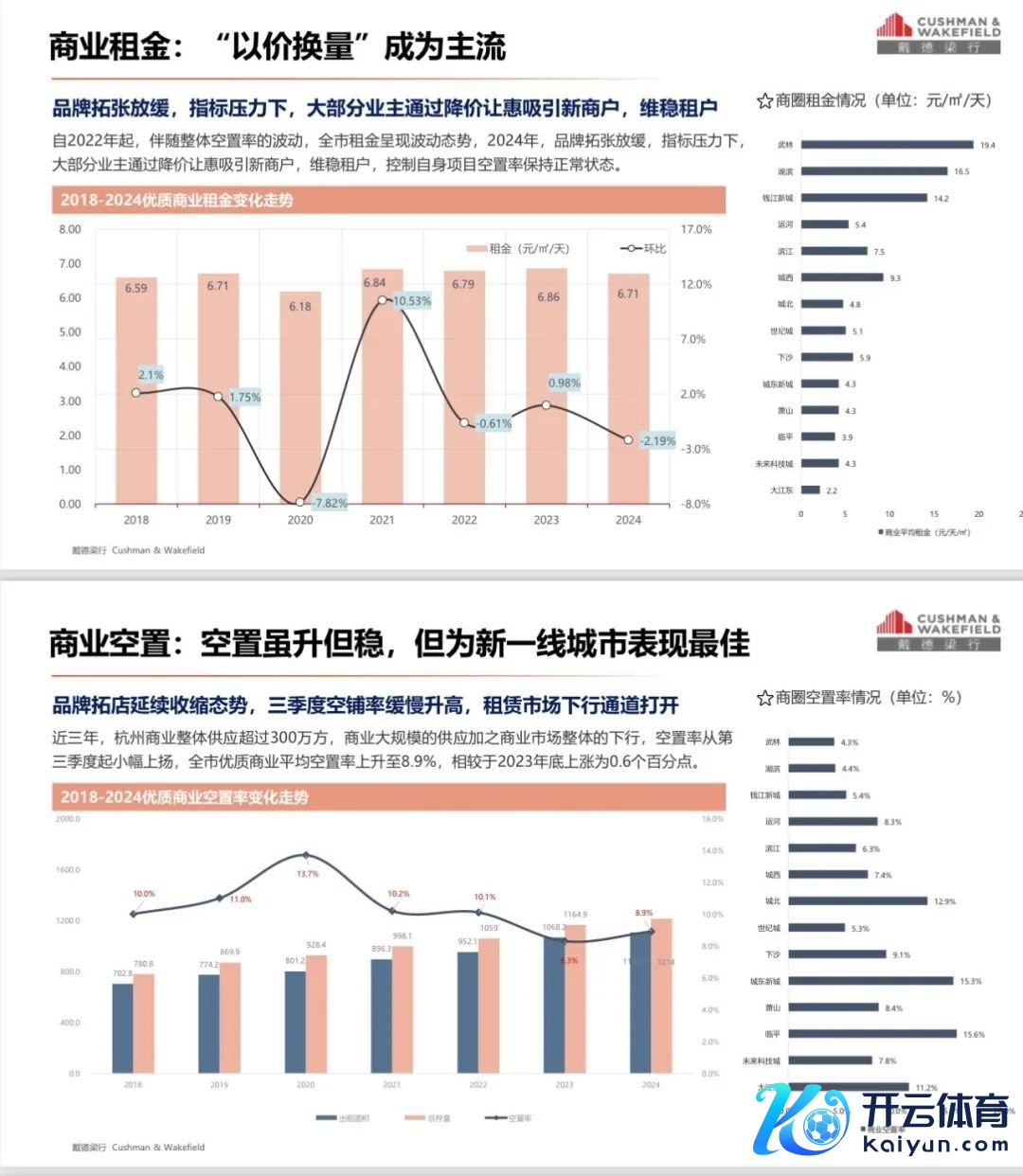 谢意梁行2024年度阐昭着示,近三年杭州营业举座供应超300万㎡,优质营业平均空置率8.9%,平均房钱已跌至6.71元/㎡/天。